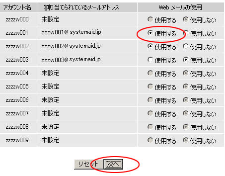 Webメールを利用したいメールアドレスを選択し、「使用する」にチェックをいれ、「次へ」を押します。 |